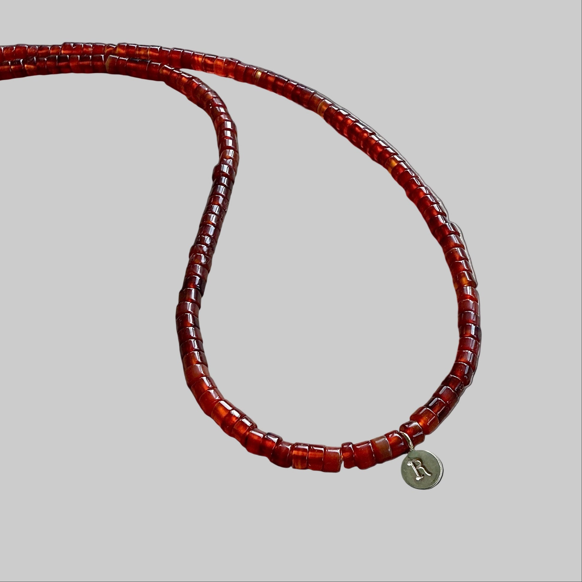 This necklace features a strand of flat round carnelian stones, paired with an 18k gold pendant and matching closure. The smooth, translucent chalcedony offers a refined, calming appearance, while the personalized gold pendant and clasp ensure lasting durability. Ideal for everyday wear.